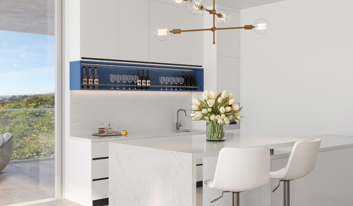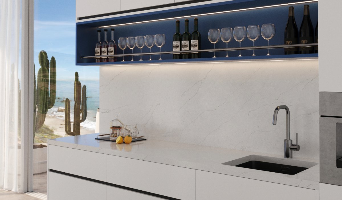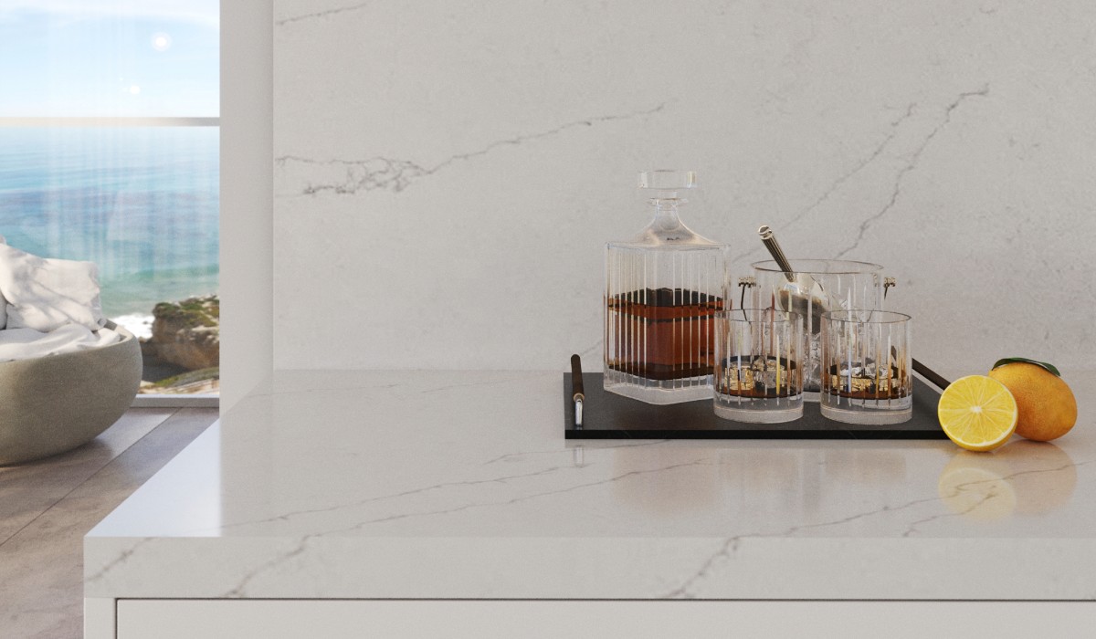 The Milano Bella quartz slab offers a serene and refreshing design, drawing inspiration from the tranquil beauty of a calm ocean at dawn. Its crisp white background evokes a sense of purity and airiness, much like the ocean’s surface before the wind stirs its depths, or a gentle mist hovering over the water at sunrise – a peaceful and pristine beauty.