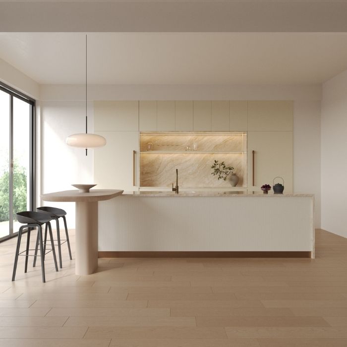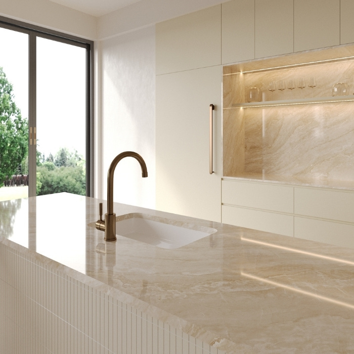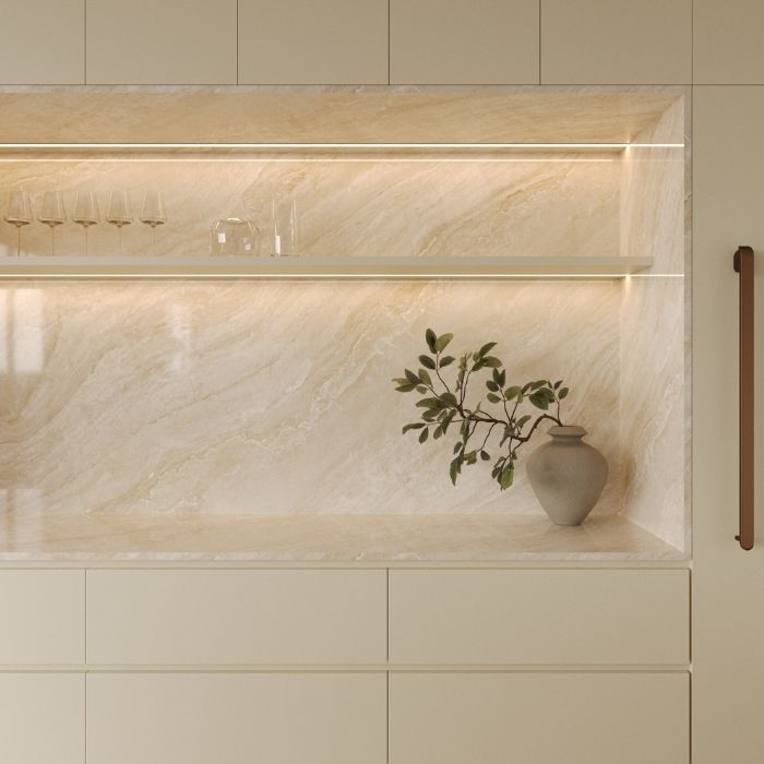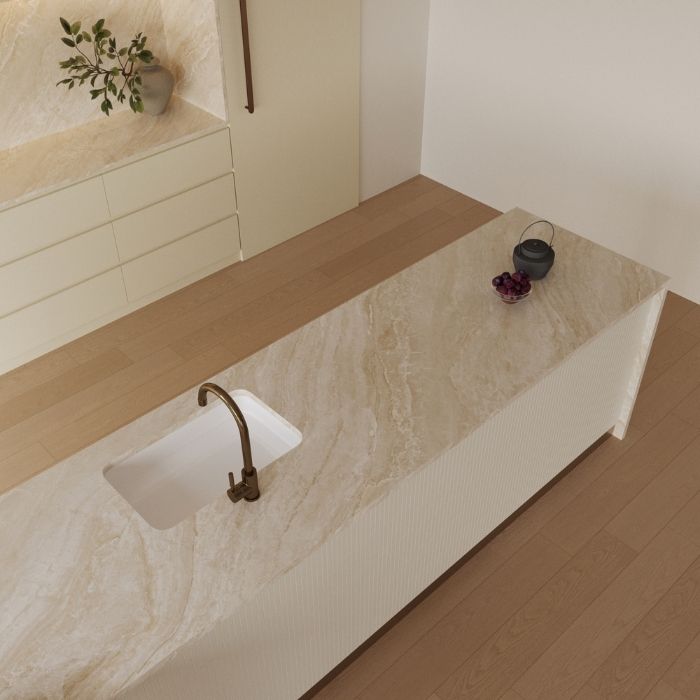 The Ra Dune slab’s background features a light cream with a gentle beige undertone, creating a warm, inviting, and highly versatile canvas for various interior styles. Unlike stark white or silvery gray, this tone has a natural, subtle depth that feels both intimate and luxurious.